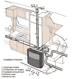 This schematic attempts to show the various elements that make up the caravan heating system and a typical example showing how they are installed.